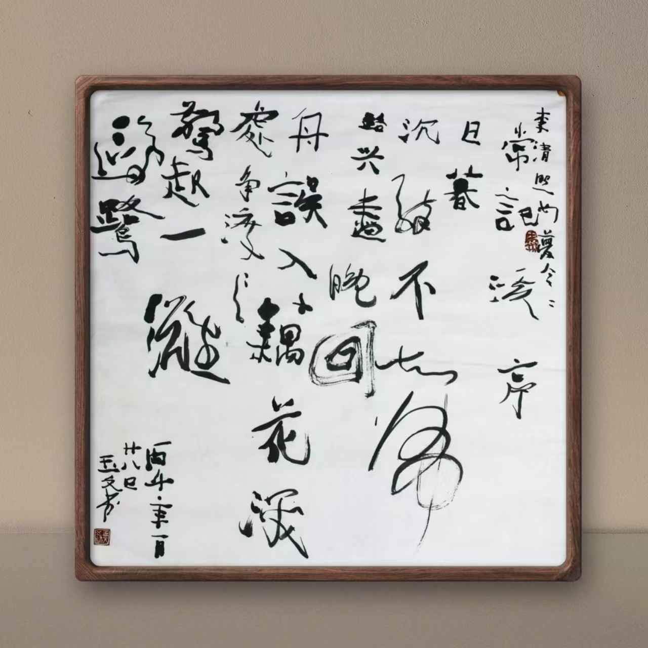 Framed by a dark border, the porcelain plate stands out against a light-colored wall, creating a striking contrast that draws the viewer’s attention to the intricate beauty of the calligraphy. At the bottom right corner of the plate, a red seal adds a touch of authenticity and elegance, serving as the artist’s signature or certification of the work.