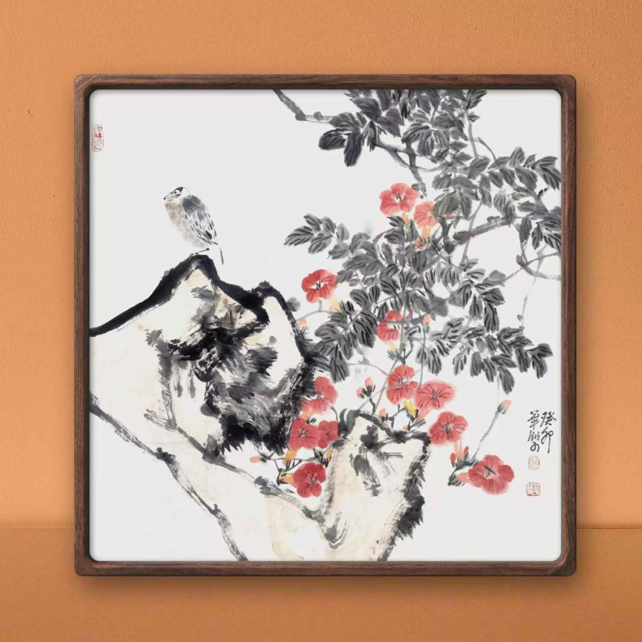 Zhao Huashuang’s painting titled “Lingxiao Overflowing with Fragrance” depicts a serene and harmonious scene where a bird perches on a tree branch, amidst a backdrop of flourishing flowers. Dominated by shades of light ink and vibrant red hues, the artwork imparts a sense of tranquility. Positioned on the left side of the painting, the bird seems to be resting or observing its surroundings. The tree branch curves gracefully, adorned with a few leaves, while the flowers cluster together on the right side, exhibiting a striking red color. The overall style of the painting is minimalist, with fluid lines that resonate with the essence of Eastern art. At the bottom right corner, there are black Chinese characters, presumably the name of the painter or the title of the work, adding a touch of cultural authenticity to the artwork.